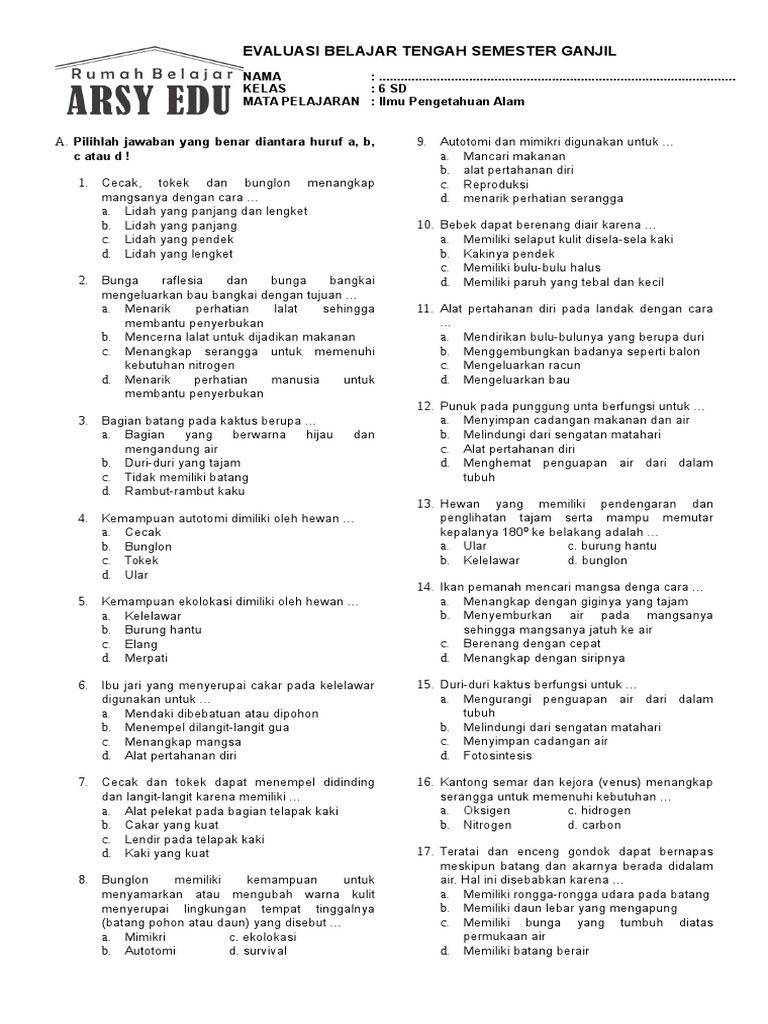 Ulangan Ke 1 Ciri Ciri Khusus Makhluk Hidup Asa Generasiku