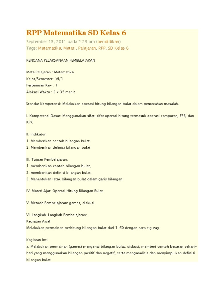 Rpp Kd 1 1 Melakukan Operasi Hitung Bilangan Bulat Copy
