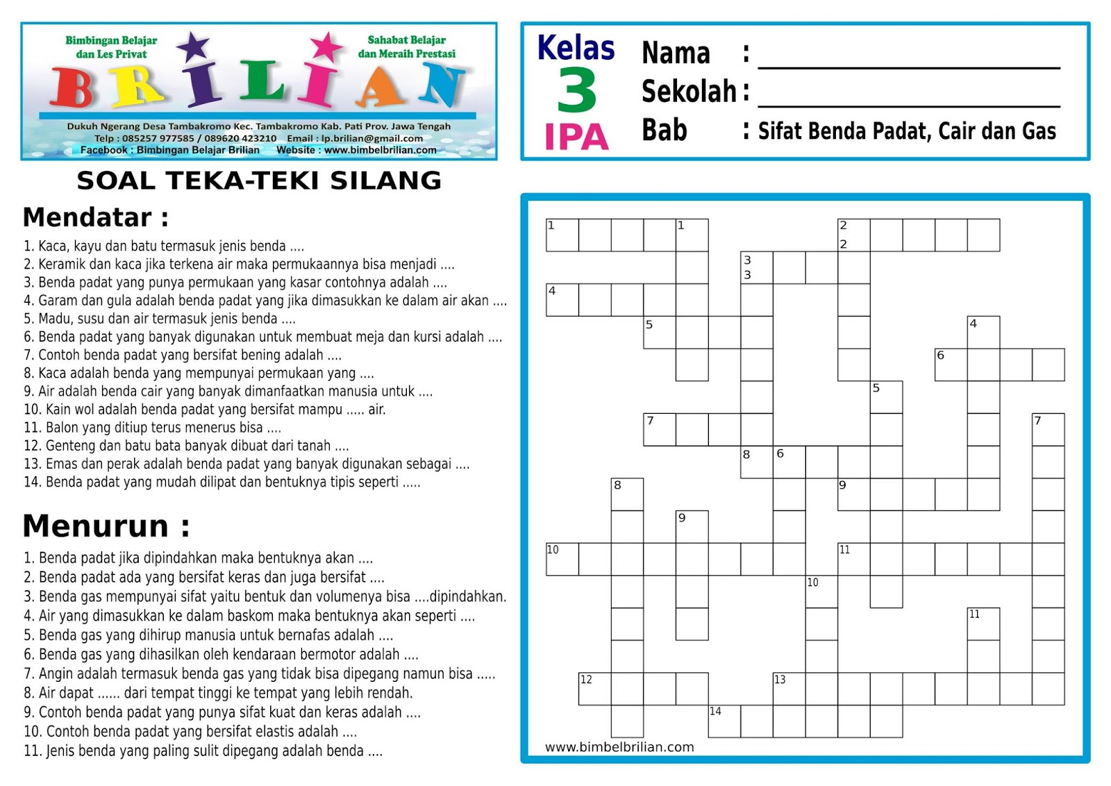 Soal Teka Teki Silang Tts Sd Ipa Kelas 3 Bab Sifat Benda Padat