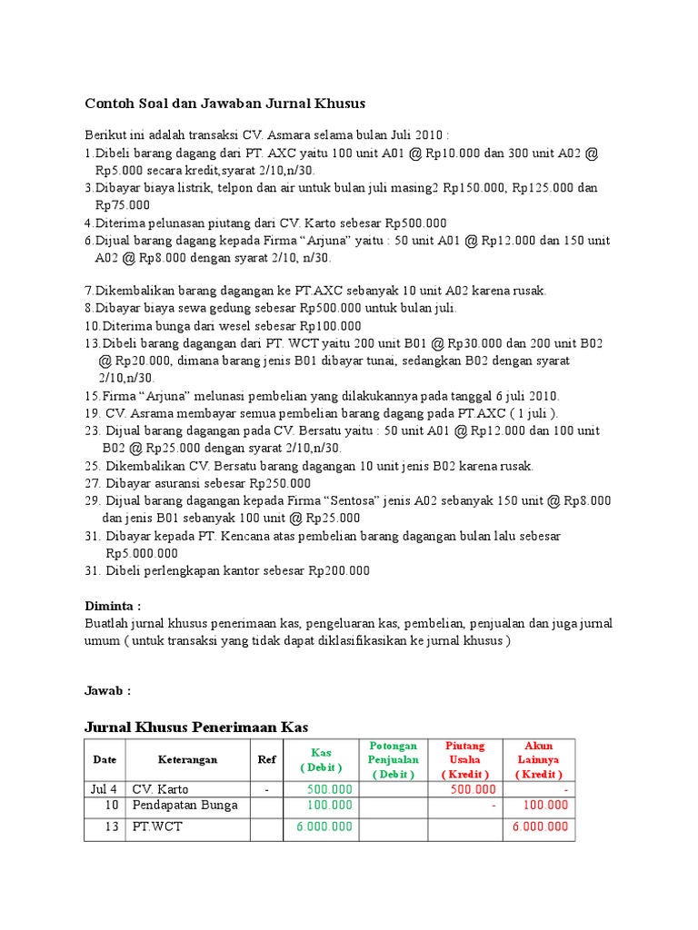 Contoh Soal Dan Jawaban Jurnal Khusus from imgv2-2-f.scribdassets.com Jurnal umum sendiri adalah jurnal yang digunakan untuk mencatat segala jenis transaksi keuangan dalam suatu periode tertentu. Pada gambar kolom jurnal tersebut, ada setidaknya lima kolom yang ada. Demikianlah cara mengerjakan contoh soal jurnal umum dengan mudah.