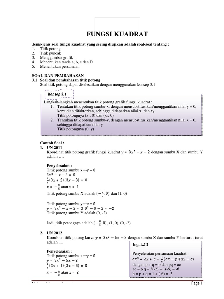 Contoh Soal Fungsi Kuadrat. Suatu fungsi f pada himpunan bilangan real (r) yang ditentukan oleh f(x) = ax2 + bx + c dengan a, b, c ∈ r dan a ≠ 0 disebut fungsi kuadrat. Grafik fungsi kuadrat dalam bidang cartesius dikenal sebagai parabola.