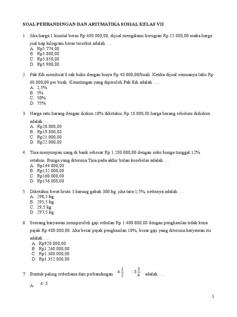Soal Perbandingan Dan Aritmatika Sosial Kelas Vii from imgv2-2-f.scribdassets.com Aritmatika sosial smp kelas 7 reviewed by my profile on 10:52 pm rating: Deret aritmatika adalah pola bilangan berderet di dalam matematika, yang mempunyai manfaat sangat penting dalam berbagai hal. Seorang pedagang membeli barang dengan harga rp20.000,00.