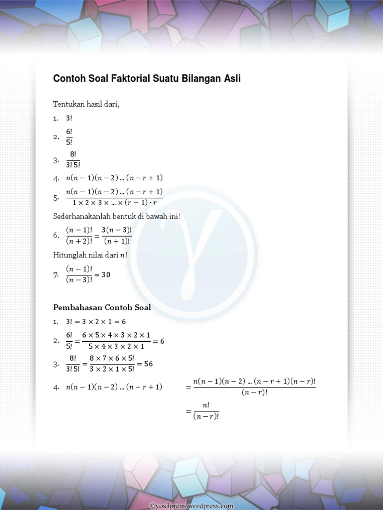 Contoh Soal Faktorial. Faktorial merupakan penulisan singkat dari perkalian sederetan bilangan bulat positif terurut hingga 1. Contoh soal faktorial 1 adalah video ke 2/14 dari seri belajar faktorial, permutasi, & kombinasi di wardaya college.subscribe wardaya college.