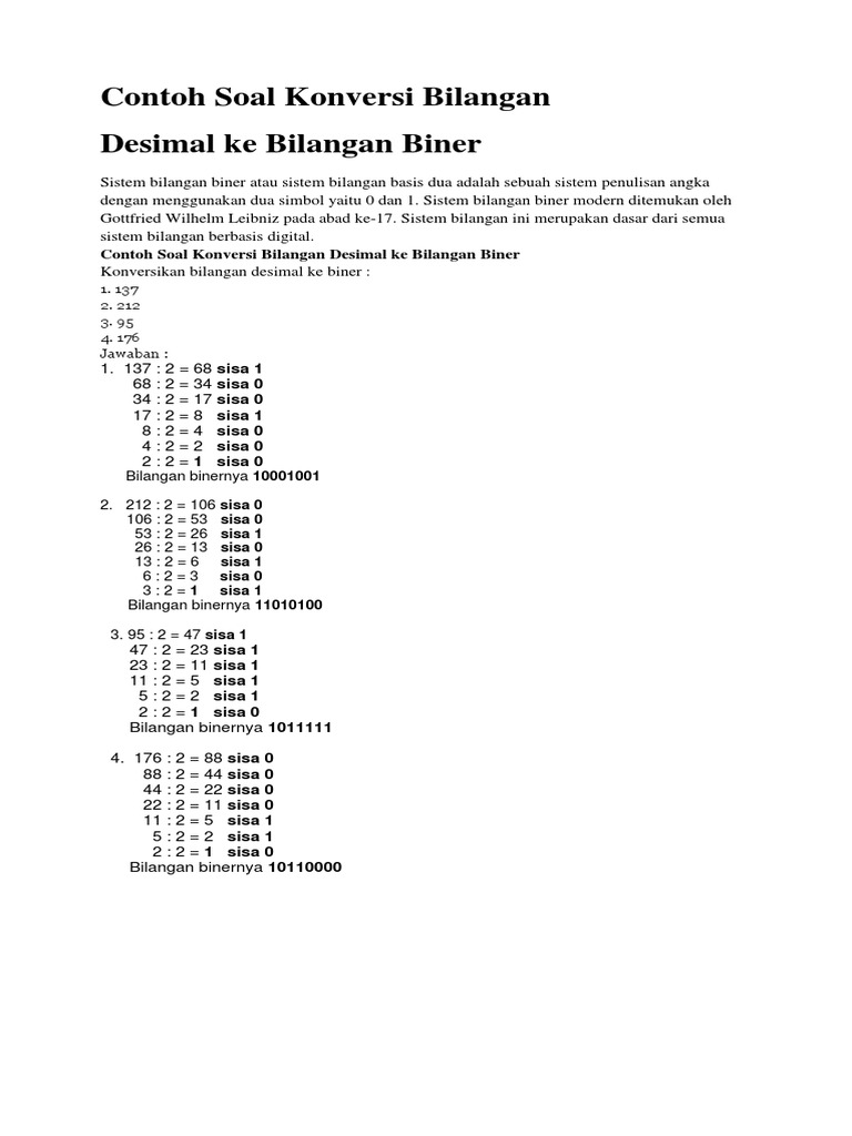 Pecahan desimal ialah merupakan sebuah pecahan yang mempunyai penyebut khusus yakni sepuluh, seratus, seribu, dan seterusnya. Contoh latihan soal desimal ke biner dan jawabannya. Kemudian sisa bilangan harus selalu dicatat. Berikut ini adalah contoh perhitungan secara manual dimana bilangan hexadesimal akan dikonversi menjadi bilangan desimal.