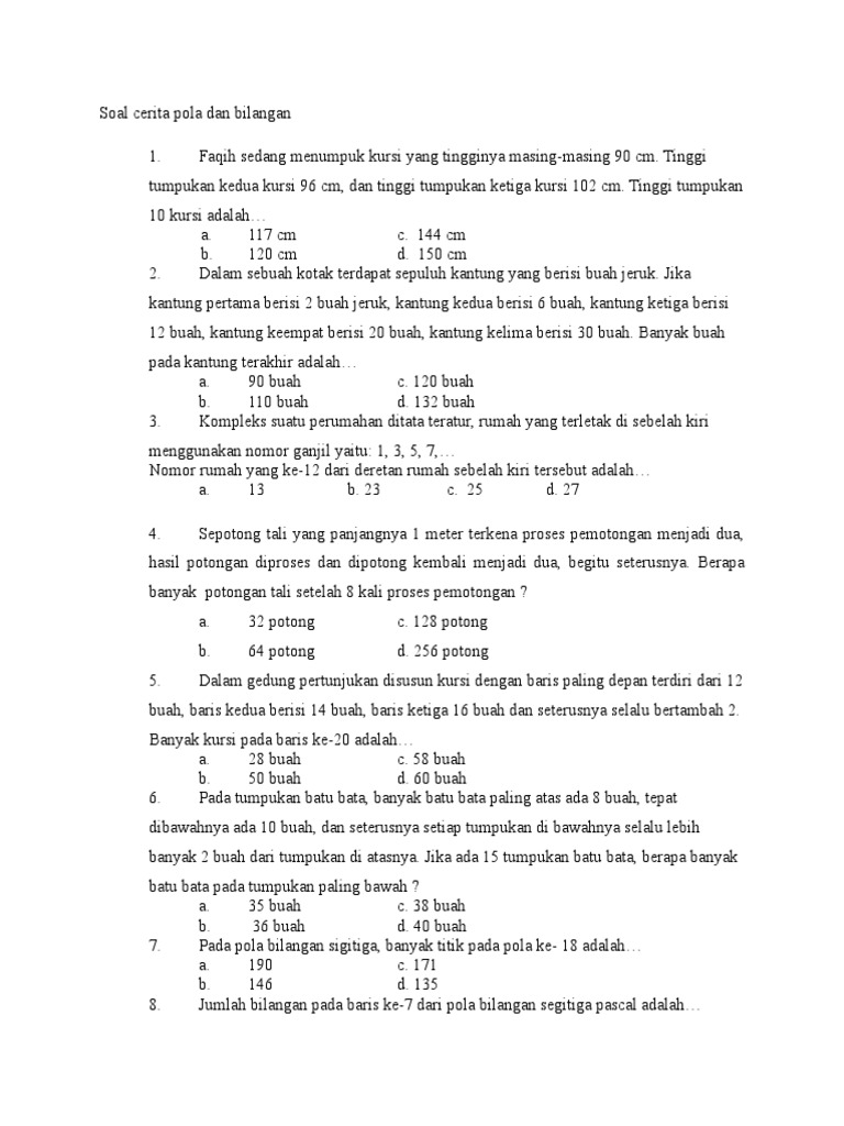 Oleh berpendidikandiposting pada 15 oktober 201616 berikut ini adalah pembahasan tentang pola bilangan, pengertian pola bilangan, contoh pola bilangan, macam macam pola bilangan, jenis. Contoh soal pola bilangan genap. Bilangan matematis memang tidak terlepas dari berbagai kajian, sehingga ilmu matematika dinilai sangat beragam. Contoh pola bilangan aritmatika adalah 2, 5, 8, 11, 14, 17, ….